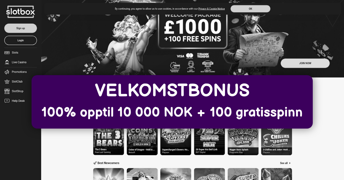 Slotbox profilerer en eksklusiv velkomstpakke via utvalgte partnere på opptil 14.000 kr + 200 gratisspinn. Strukturen som oppgis i kilder inkluderer: